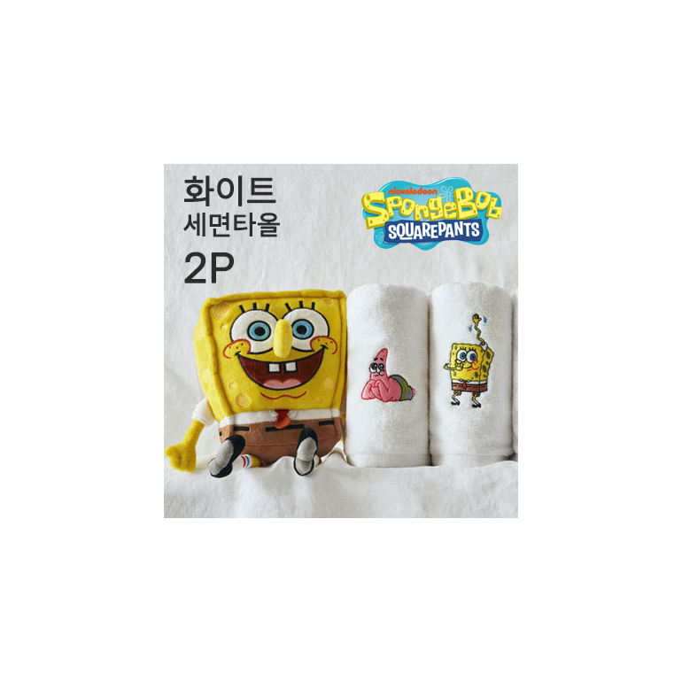 [국내생산] 스폰지밥&뚱이 캐릭터 화이트 세면타올수건 2P