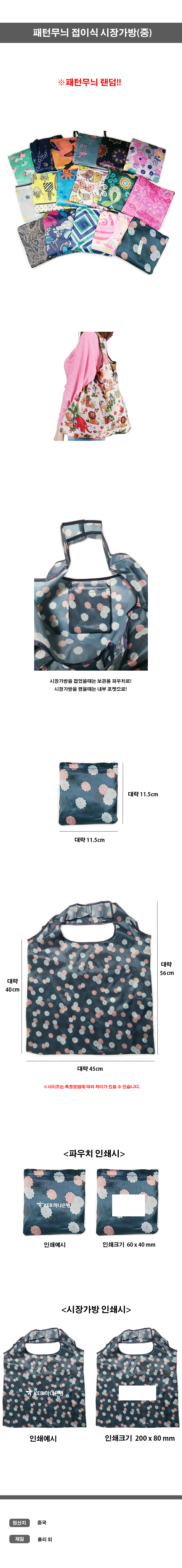 패턴 접이식 시장가방(중) 시장바구니 휴대용 장바구니 포켓용 방수백 포켓백