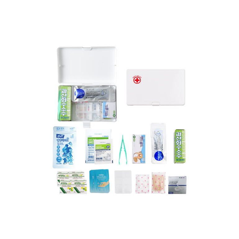 드레싱밴드1,핀셋,반창고1,면봉10p,과산화수소수1,거즈붕대1,알콜스왑4,밴드8p,상비약케