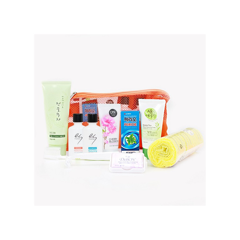 [여행용110호] 엘라스틴샴푸,린스,바디,페리오치약20g,긴칫솔,비누,비누곽, 면도기,비타민c핸드크림,lg생크림폼,샤워타올,더블찍찍이파우치