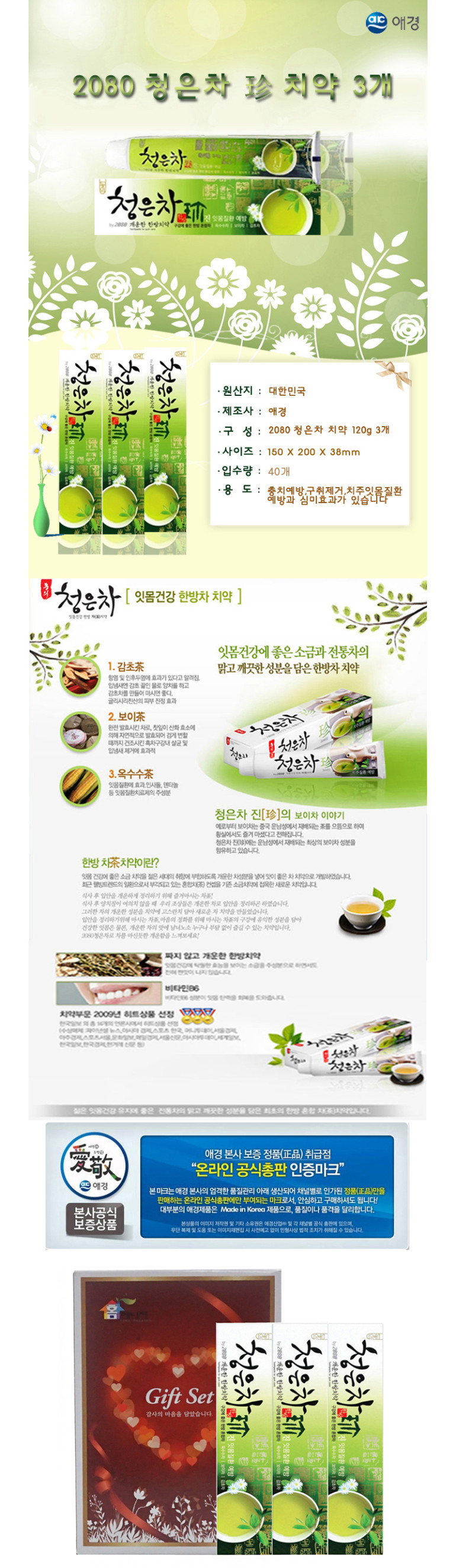 [칫솔/덴탈용품]2080 애경 청은차 치약 120g 3p세트