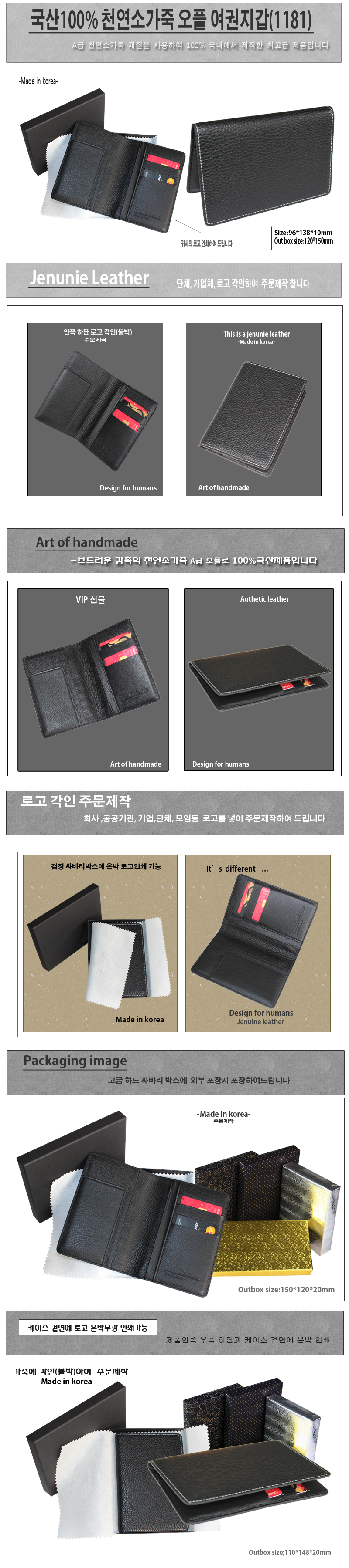 ◆국산100% 천연소가죽 오플블랙 여권지갑(1181)◆ -구성:국산 100% 천연소가죽 오플 블랙 -각인:지갑 안쪽 우측 하단 각인(불박-금형으로 가죽에 열을 가하여 누름) -포장:고급개별 검정싸바리케이스(케이스 겉면 은박무광 로고인쇄가능) ※기본수량 100개 이상 주문시 불박(각인)무료