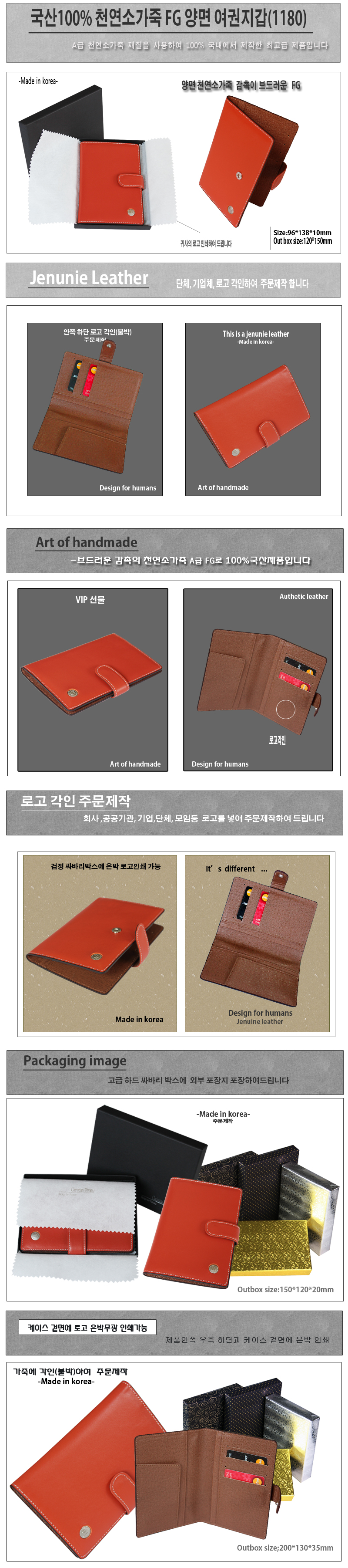 ◆국산100% 천연양면소프트FG & 사피아노프라다브라운소가죽 고급 여권지갑(1180)◆ -구성:국산 100% 천연양면소가죽(외부 소프트FG,내부 프라다 사피아노무늬 소가죽) -각인:지갑 안쪽 우측 하단 각인(불박-금형으로 가죽에 열을 가하여 누름) -포장:고급개별 검정싸바리케이스(케이스 겉면 은박무광 로고인쇄가능) ※기본수량 100개 이상 주문시 불박(각인)무료