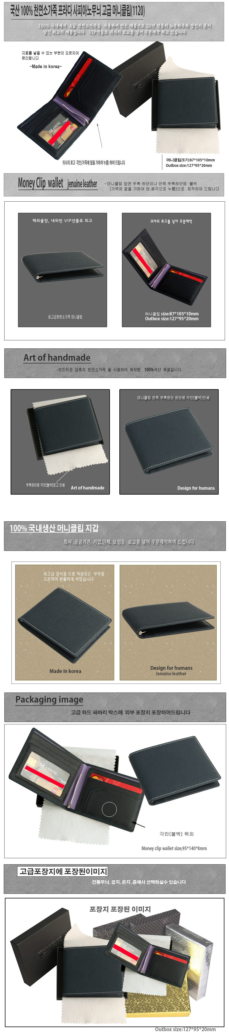 ◆국산100% 천연 양면 사피아노 소가죽 고급 머니클립(1120)◆ -구성:국산 100% 천연양면 사피아노 소가죽 머니클립 -각인:지갑 안쪽 우측 하단 각인(불박-금형으로 가죽에 열을 가하여 누름) -포장:고급개별 검정싸바리케이스(케이스 겉면 은박무광 로고인쇄가능) ※기본수량 100개 이상 주문시 불박(각인)무료