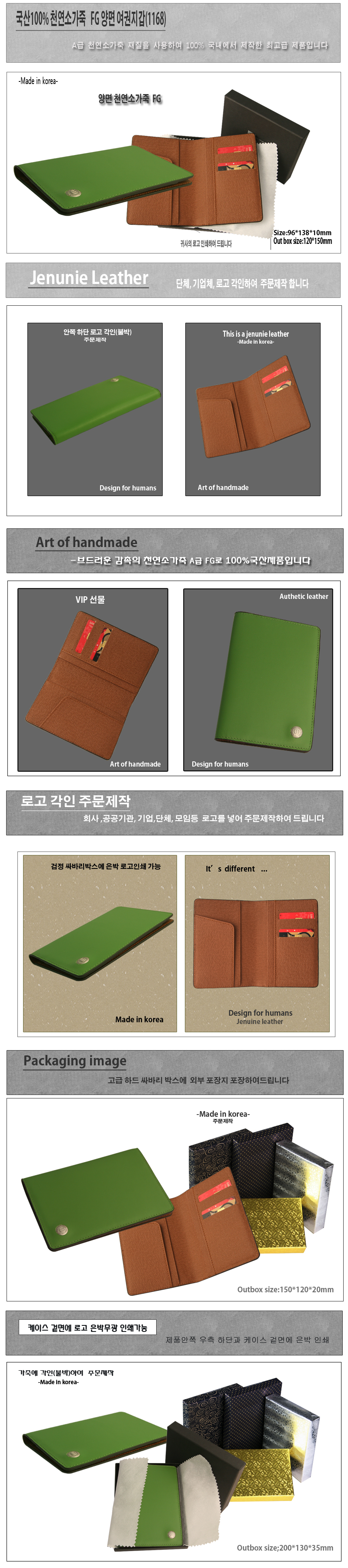 ◆국산100% 천연 양면 소프트FG 소가죽 고급 여권지갑(1168)◆ -구성:국산 100% 천연양면 소프트FG 소가죽 여권지갑 -각인:지갑 안쪽 우측 하단 각인(불박-금형으로 가죽에 열을 가하여 누름) -포장:고급개별 검정싸바리케이스(케이스 겉면 은박무광 로고인쇄가능) ※기본수량 100개 이상 주문시 불박(각인)무료